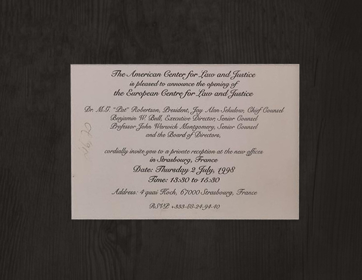 On July 2, 1998, the European Centre for Law and Justice (ECLJ) opened its doors in Strasbourg, on the initiative of Jay Sekulow and Thomas Patrick Monaghan, lawyers; and with the support of Pat Robertson, Benjamin Bull, and John Montgomery, to defend life and religious freedom before the European institutions.